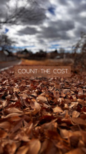 *For those of you who prayer walk, ponder the phrase, ‘Count the Cost’, and listen to what the Holy Spirit reveals.